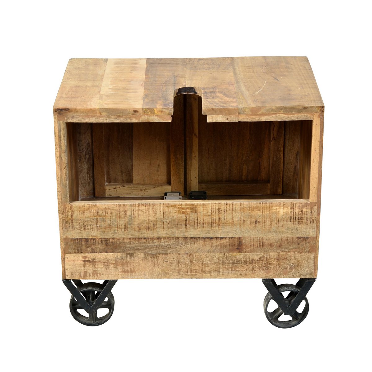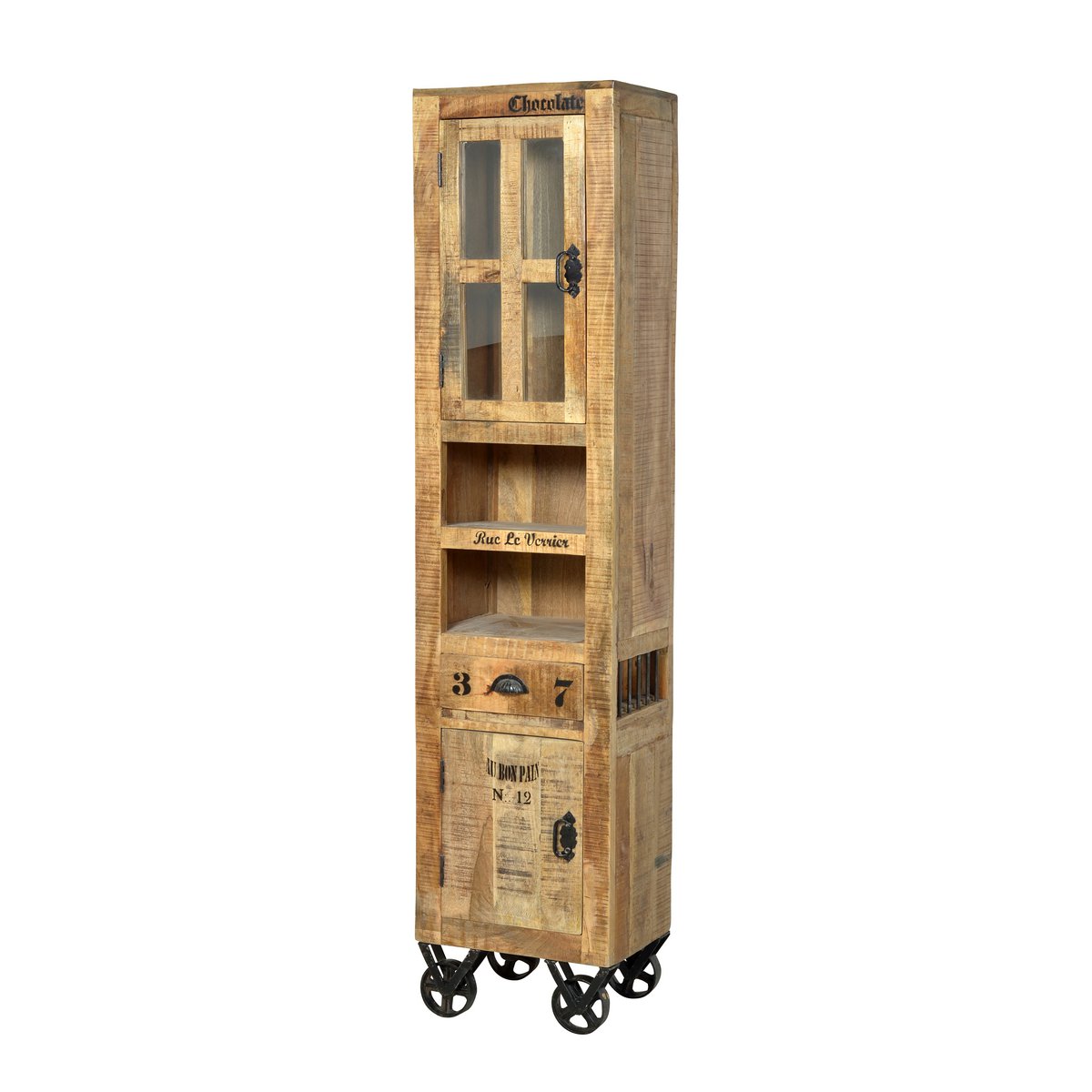 Mit diesem Bad Set aus einer Kombination aus recyceltem Mangoholz und Metallbeschlägen in antikschwarz holen Sie sich rustikalen Charme in Ihr Badezimmer. Das verwendete Holz stammt von alten Scheunen, Häusern und Reiströgen und ist besonders stark und widerstandsfähig. Durch die naturgemachte Witterung entsteht ein besonders warmer Farbton. Abgerundet wird der industrielle Look durch schwarze Aufdrucke, die an Transport- und Lagerkisten erinnern. Die handgeschmiedeten Rollen und Beschläge passen ideal in die industrielle Themenwelt, die diese Möbelserie erzählt. Durch die Rollen stehen die Möbel leicht erhöht, was eine gute Luftzirkulation im Bad ermöglicht und außerdem die Reinigung des Bodens erleichtert. Ein Hochschrank, eine kleine Kommode, ein Hängeschrank und der Waschbecken-Unterschrank bieten genug Platz für Handtücher, Putzmittel und Co, dazu noch ein Spiegel mit Ablage. Hochschrank 44x34x191 cm, Unterschrank 66x43x61 cm, Spiegel 67x12x80 cm, kleiner Schrank 44x34x82 cm, Hängeschrank 44x21x70 cm.